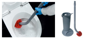 Complete kit. • Ergonomic toilet brush for professional application (66cm handle). • No bending, distance to bowl, no splashes on clothing. • Increased productivity – replaceable brush heads and 360° cleaning radius. • Swab for optimal application of cleaning products. • Hygienic and ergonomic holder. • Brush stands firmly; holder can be hand-carried or hung on cart. • Detachable base, brush remains dry, holder can be disinfected.